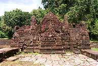 Le temple Neak Pean, qui signifie "Les serpents enroulés", fut construit au XIIe siècle par Jayavarman VII. Ce temple occupait le centre du baray du Preah Khan (Jayatatâka) aujourd'hui asséché à l'instar des Mébons des barays oriental et occidental. Les travaux de G. Coedes, L. Finot et V. Goloubew ont démontré que l''ensemble représentait symboliquement l'Anavatapta : le lac sacré et mythique de l'Himalaya vénéré en Inde pour les vertus curatives de ses eaux et qui donnait naissance aux quatre grand fleuves de la terre par quatre gargouilles scuptées situées aux quatre points cardinaux. Le chinois Tcheou Ta-Kouan (Zhou Daguan) en fait mention : "Le lac septentrional dont l'eau est éclairée par la lumière de la tour d'or". Il évoque aussi le lion d'or, le Bouddha d'or, l'éléphant, le bœuf et le cheval de bronze. Le Neak Pean est constitué d'un grand bassin central de 70 m de côté auquel sont accollé quatre bassins plus petits de 25 m de côté. Chaque petit bassin est relié au grand par une niche ou chapelle dont les " gargouilles " font référence à la légende du lac Anavatapta : un lion au Sud, un cheval à l'Ouest, un éléphant au Nord et une tête d'hommeà l'Est se substituant au taureau du lac mythique. Au centre du bassin émerge une l'île circulaire de 14 m de diamètre surmontée d'une tour. La base de l^'île entourée de deux serpents dont la tête émerge côté est et la queue côté ouest. Cet entrelacement de serpents est à l'origine du nom du temple. La tour du sanctuaire central de plan cruciforme s'ouvrait à l'origine sur quatre portes. Trois ont été murées par de magnifiques représentations de Lokeçvava. Dans le bassin central, faisant face aux têtes des nagâs, on peut admirer une superbe statue de Balâha, le cheval volant portant accrochés à ses flancs le marchand Simhala et ses compagnons qui,selon la légense, échappent ainsi à l'appétit des ogresses de l'île des râksasîs (Sri Lanka). |